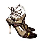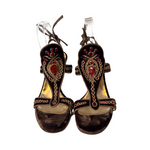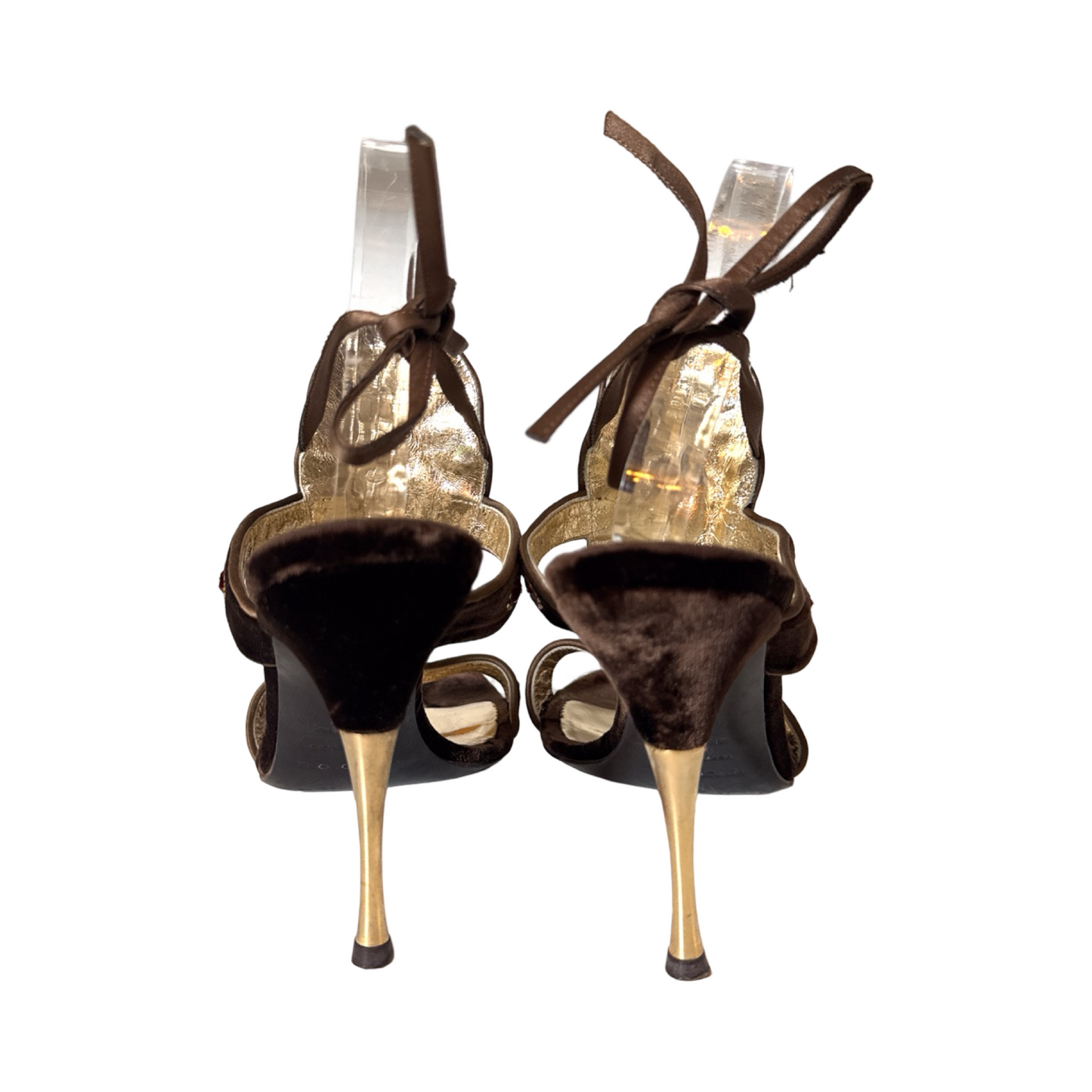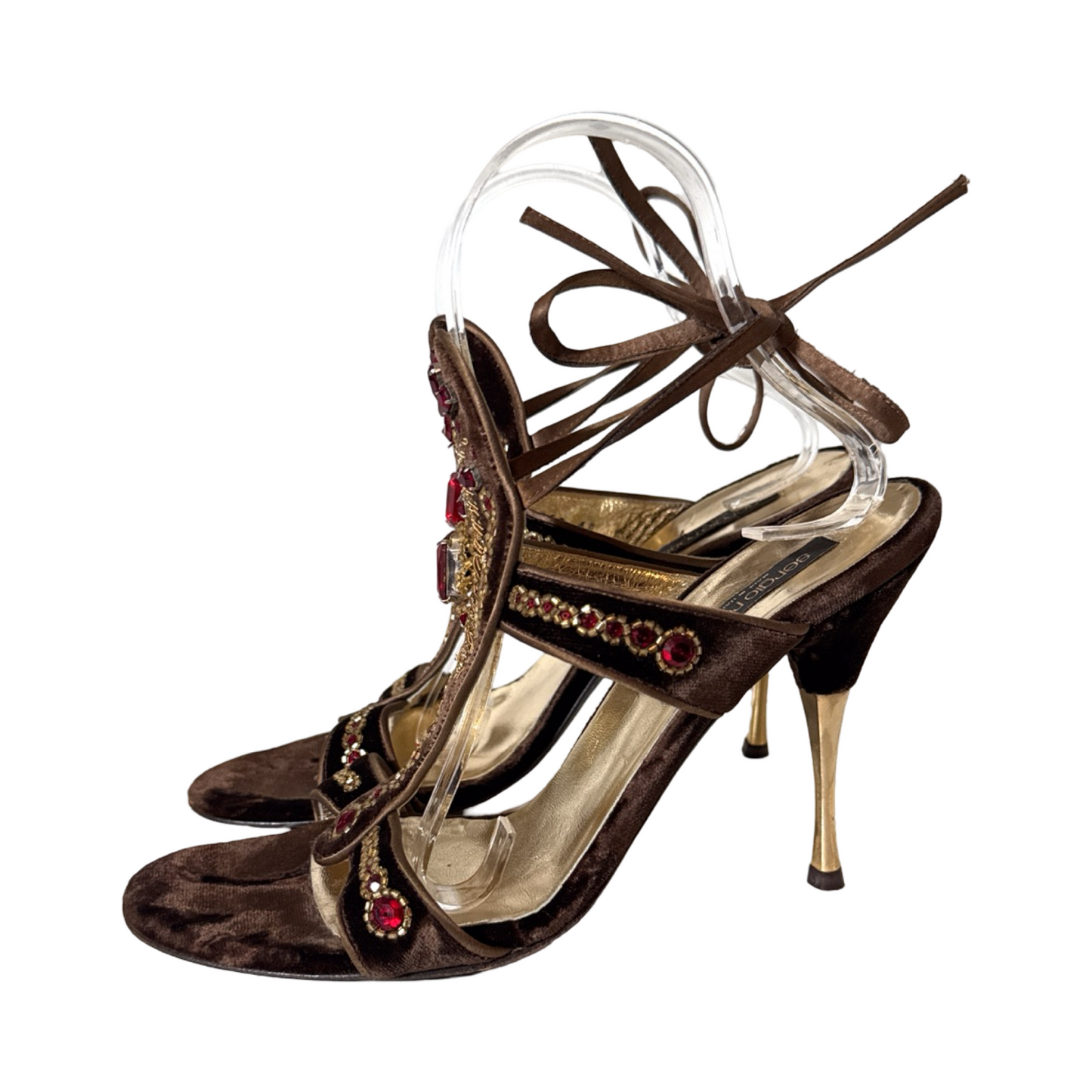 Brown velvet sandals with ruby encrusted jewels. In good used condition 4.5 inch heel
