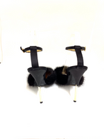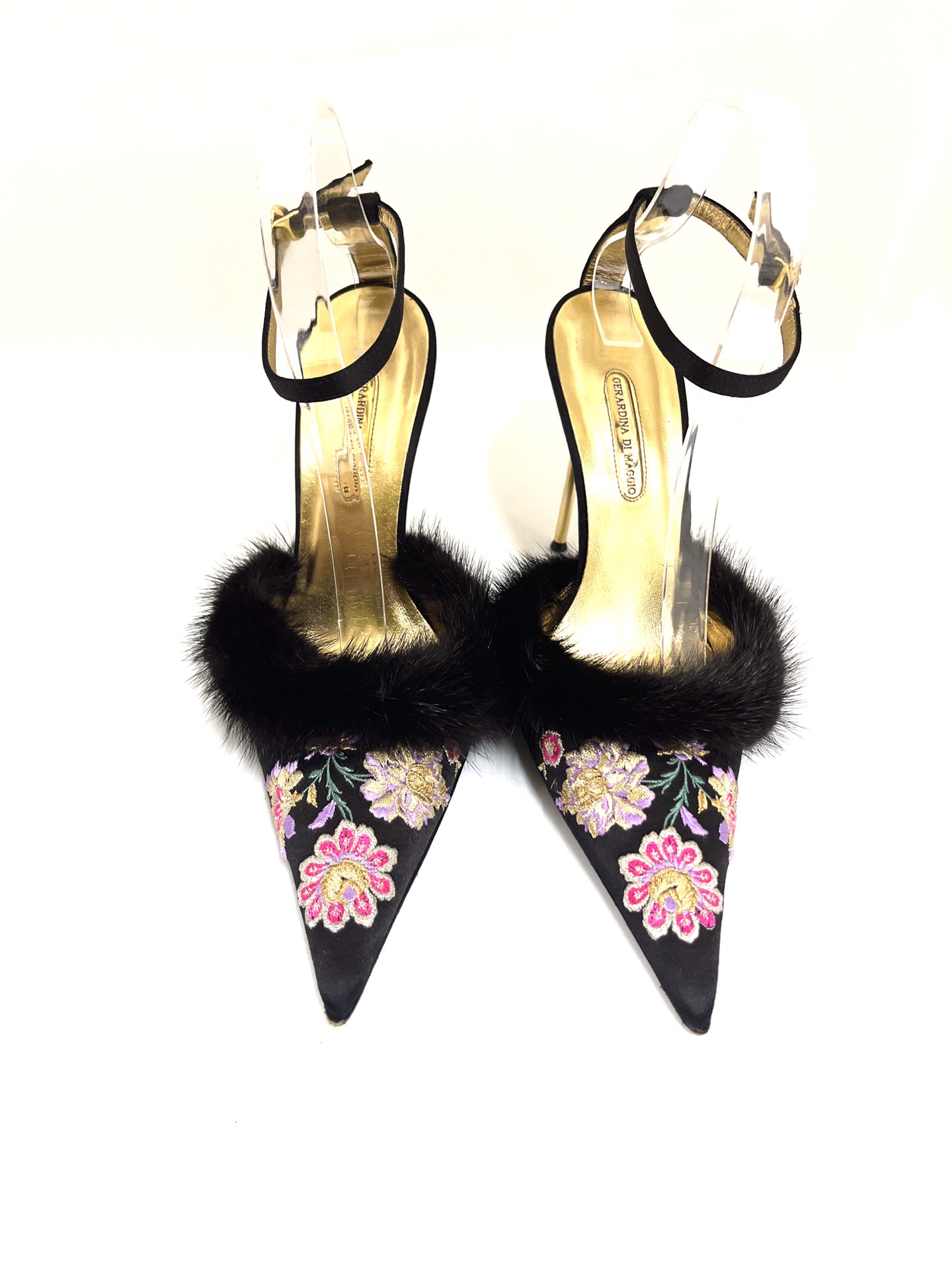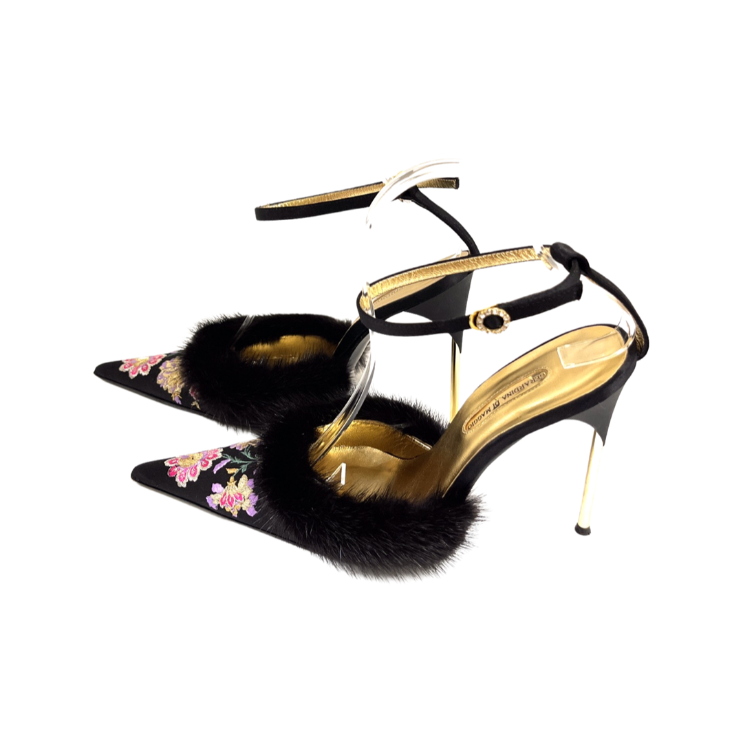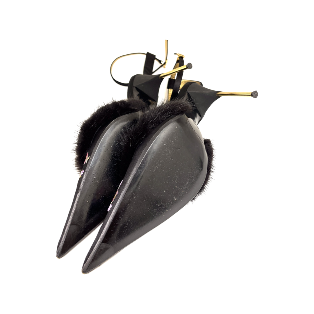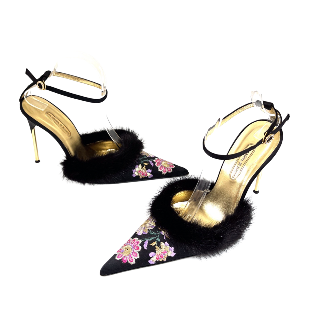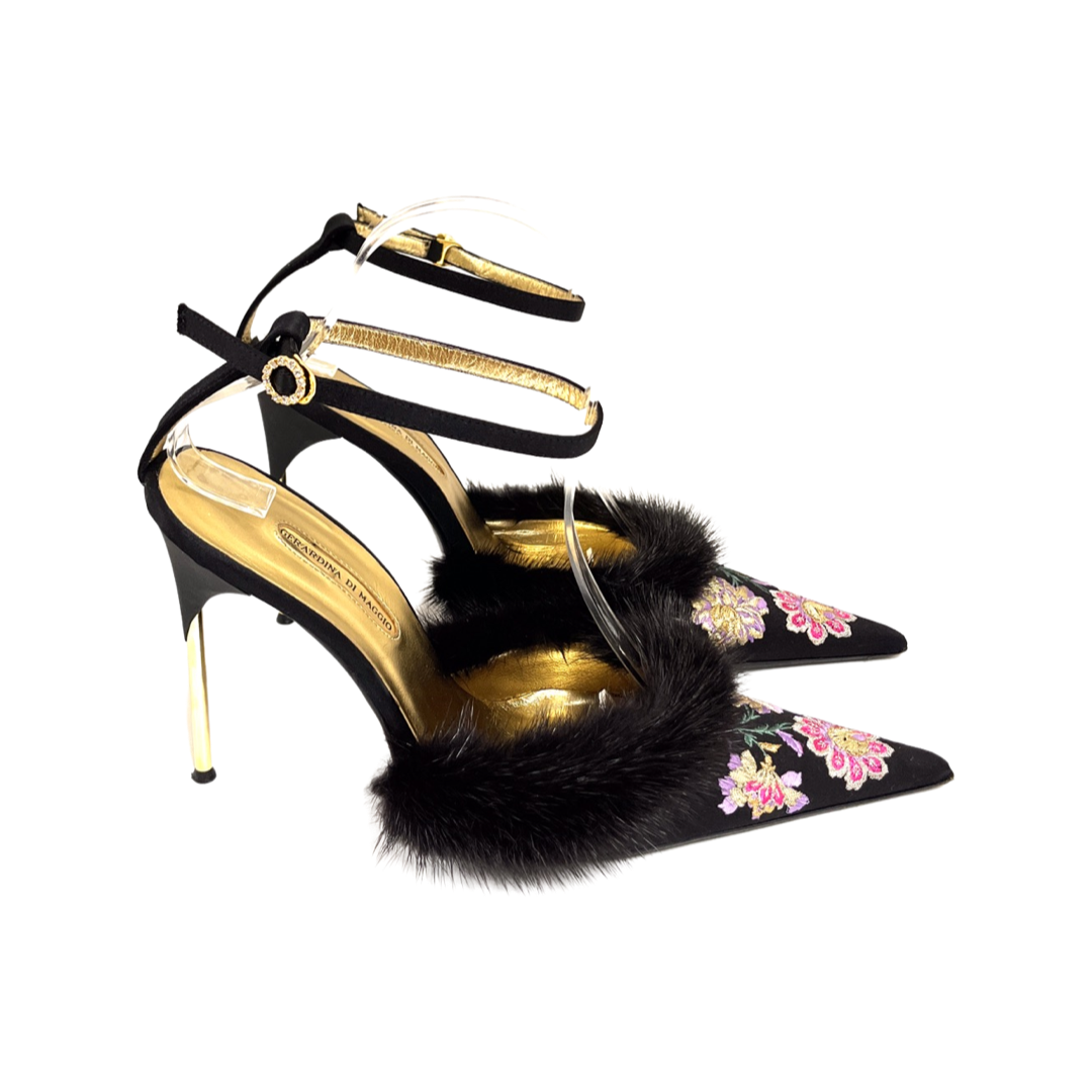 Vintage Italian satin embroidered pointed toe pumps with mink trim. In excellent condition.