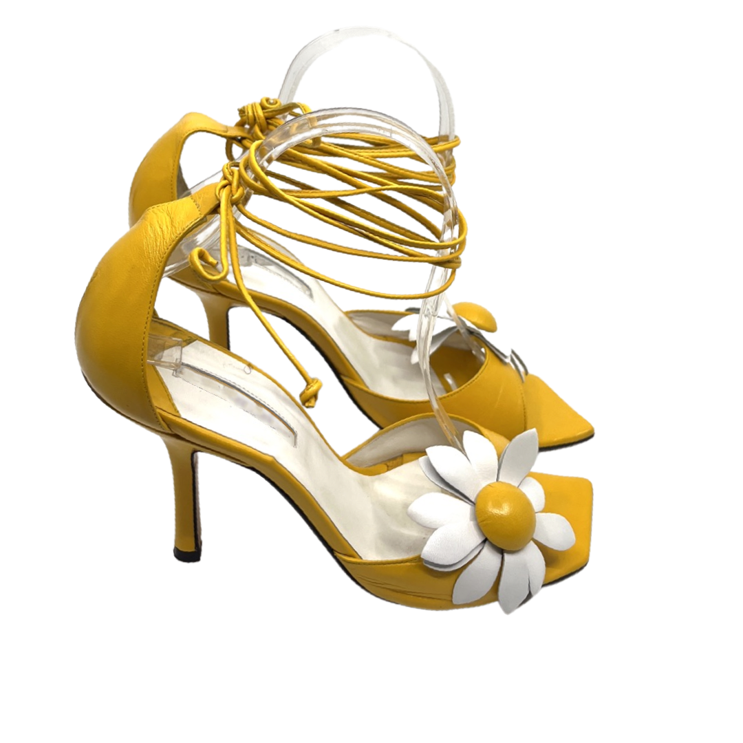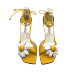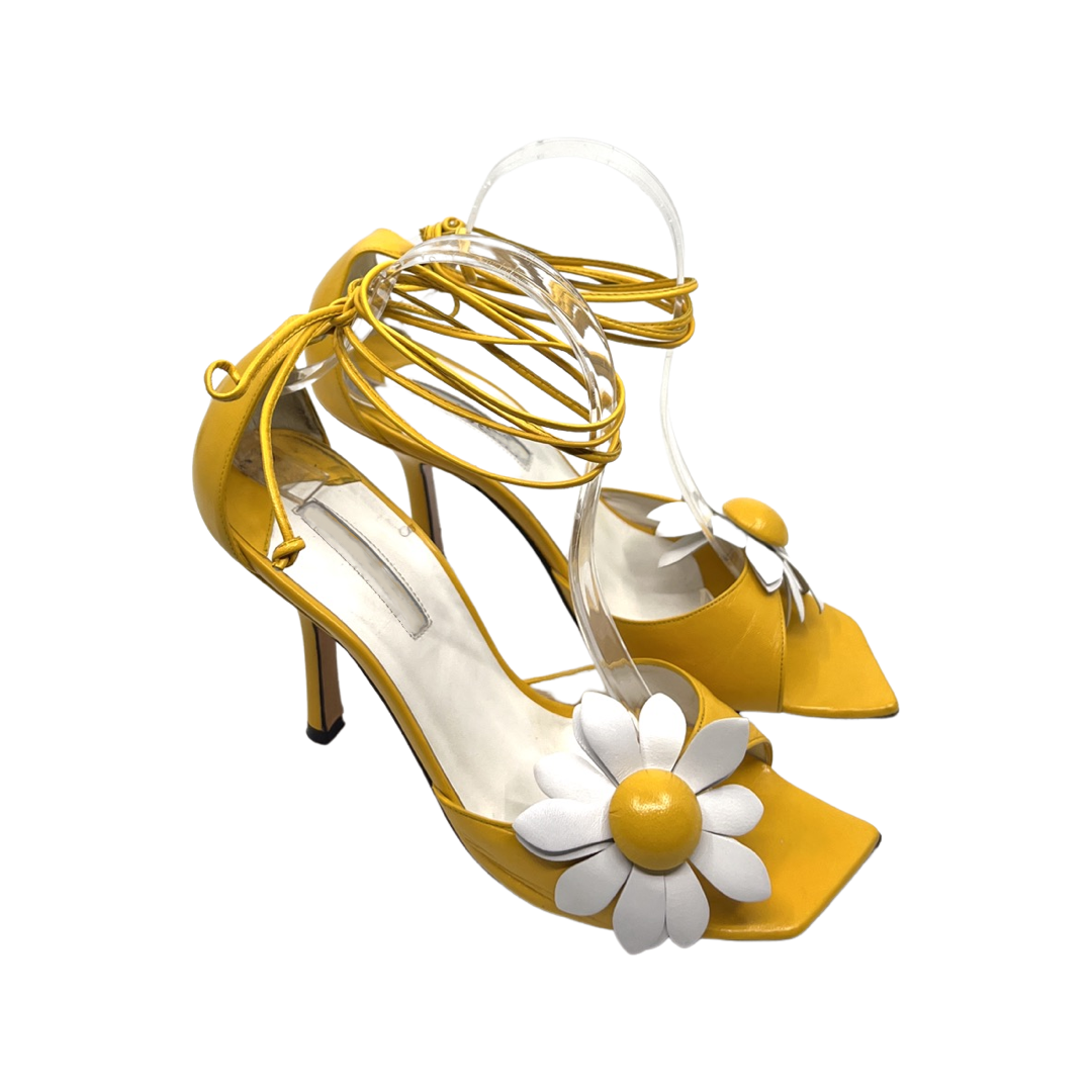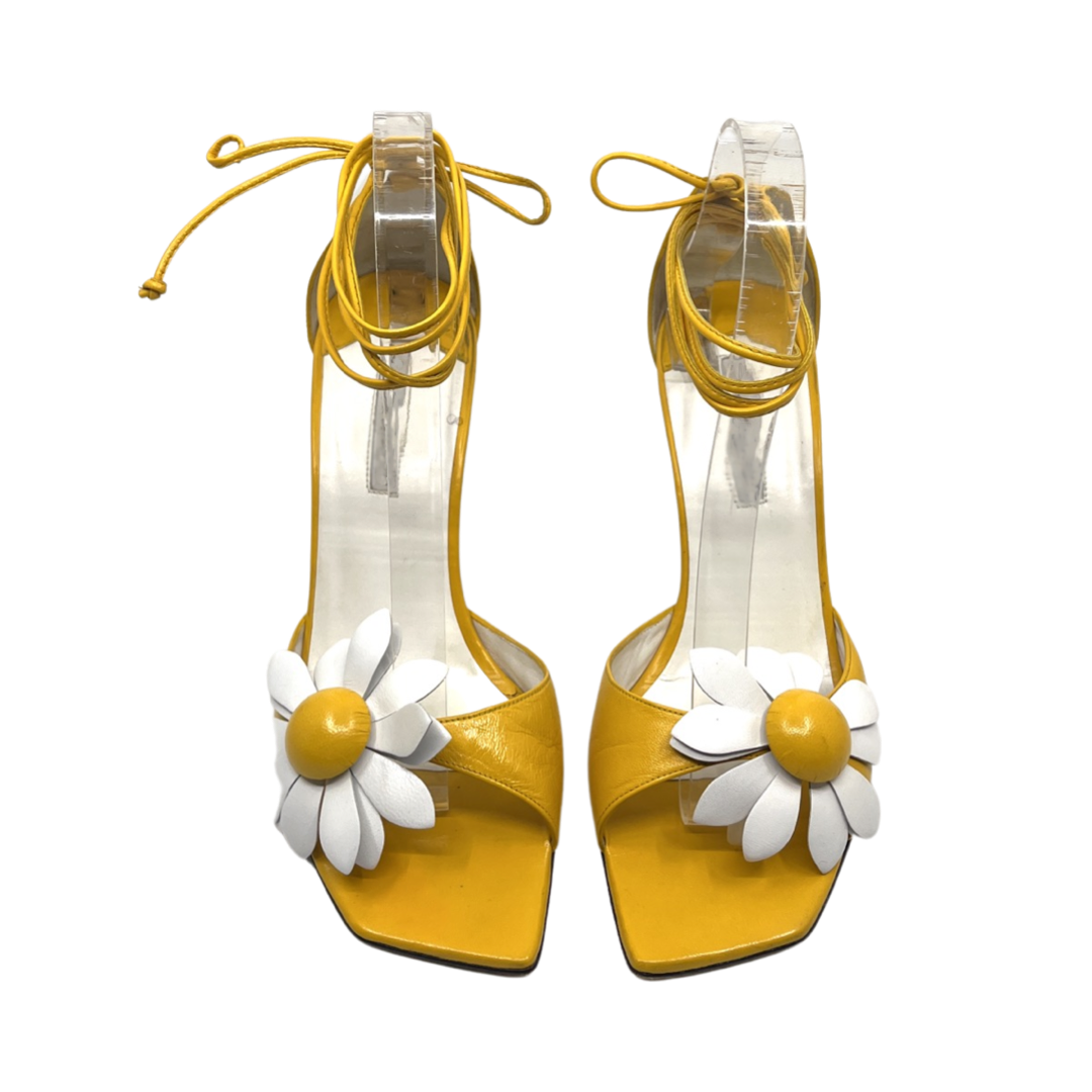 Vintage yellow leather lace up sandal with floral detail. In good condition with slight signs of wear on back not obvious when wearing. 4 inch heel.