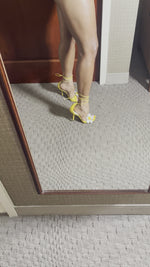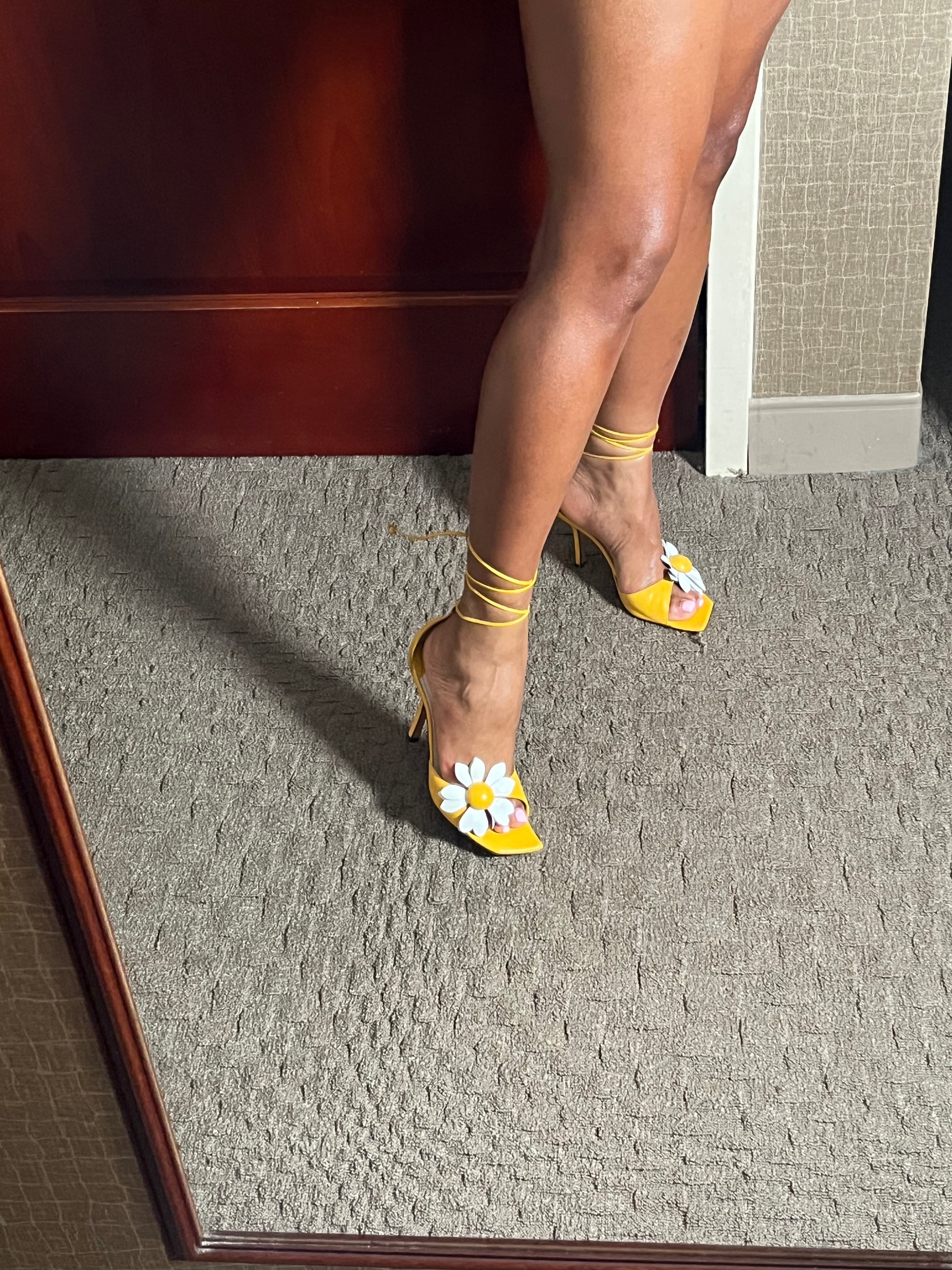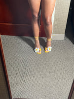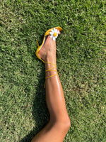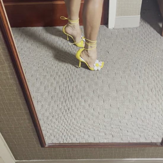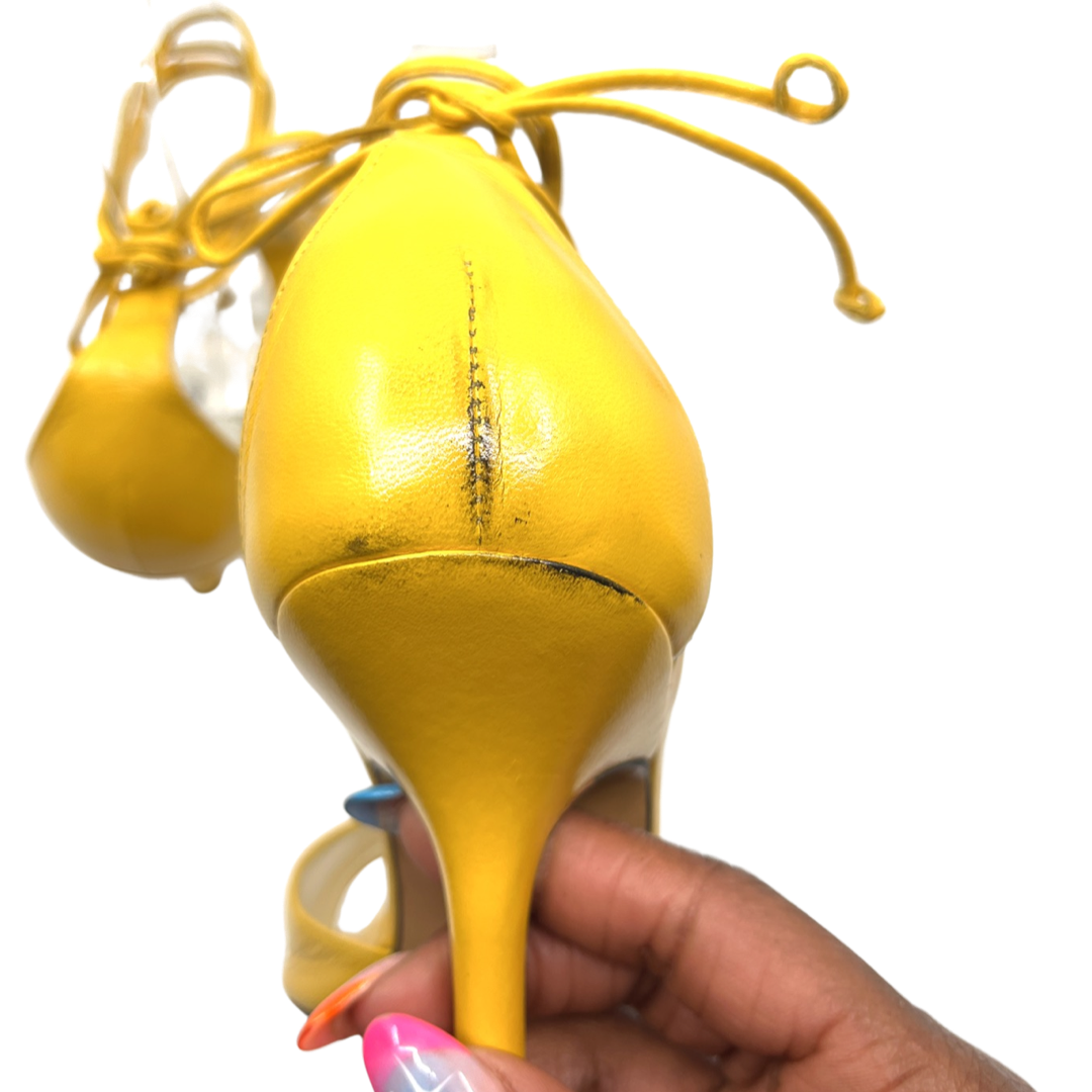 Vintage yellow leather lace up sandal with floral detail. In good condition with slight signs of wear on back not obvious when wearing. 4 inch heel.