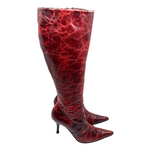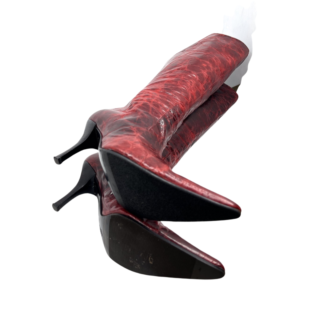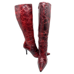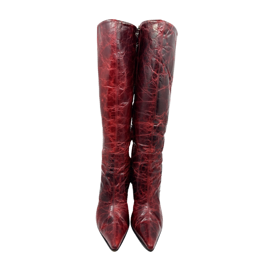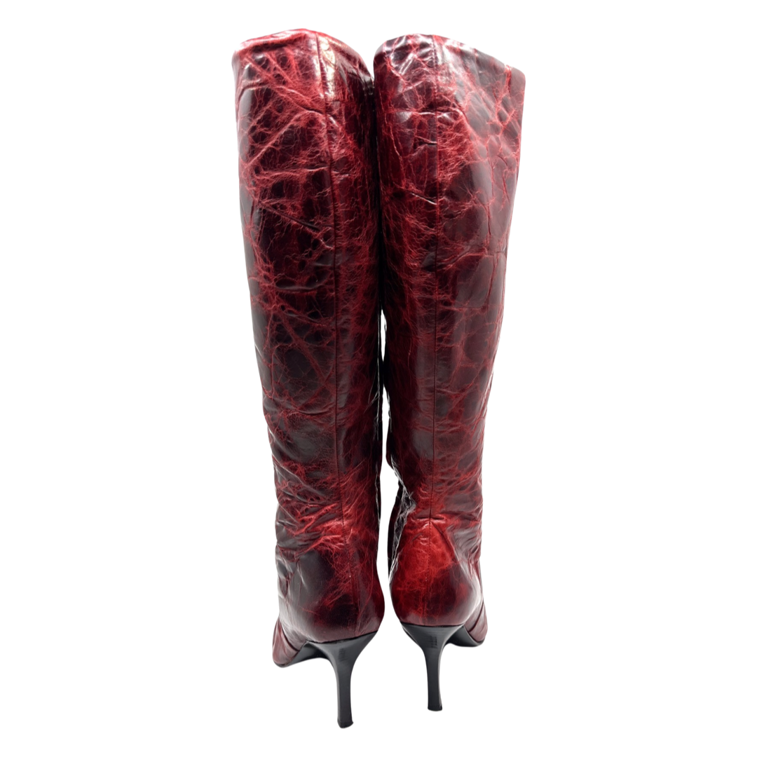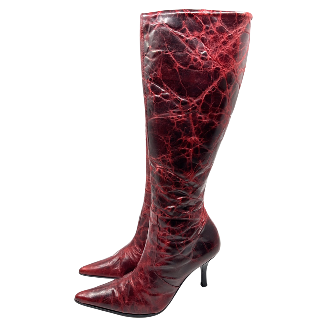 Vintage Italian oxblood cracked leather pointed toe knee high boots lined with black shearling. In excellent condition *3 inch heel, 15inch calf circumference.