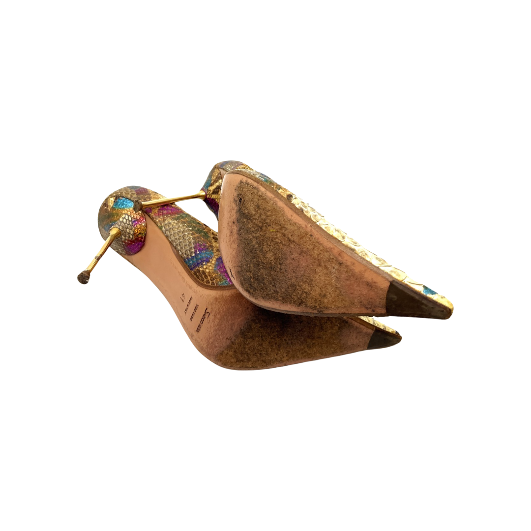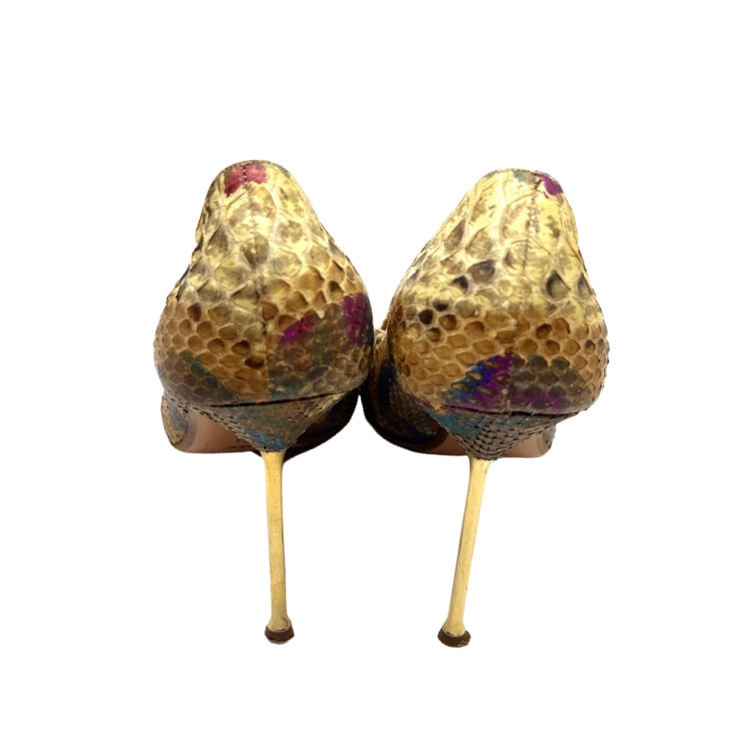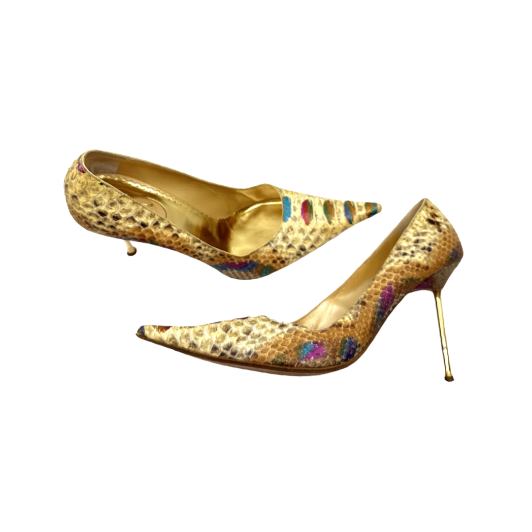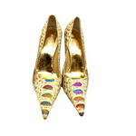 Vintage Italian snakeskin pointed toe with gold metal stiletto heel. * slight scratch on right metal heel not obvious when on. * 4 inch heel.