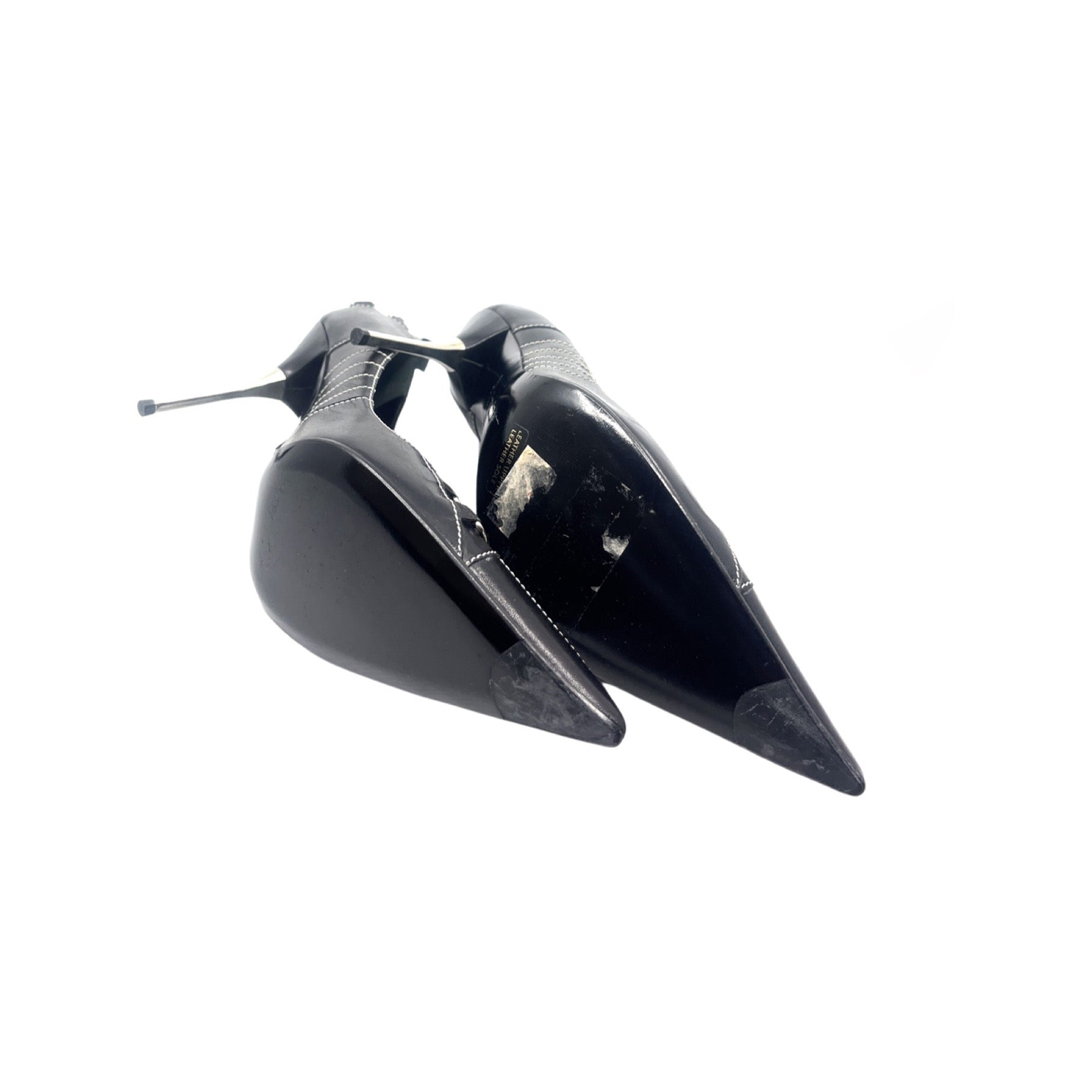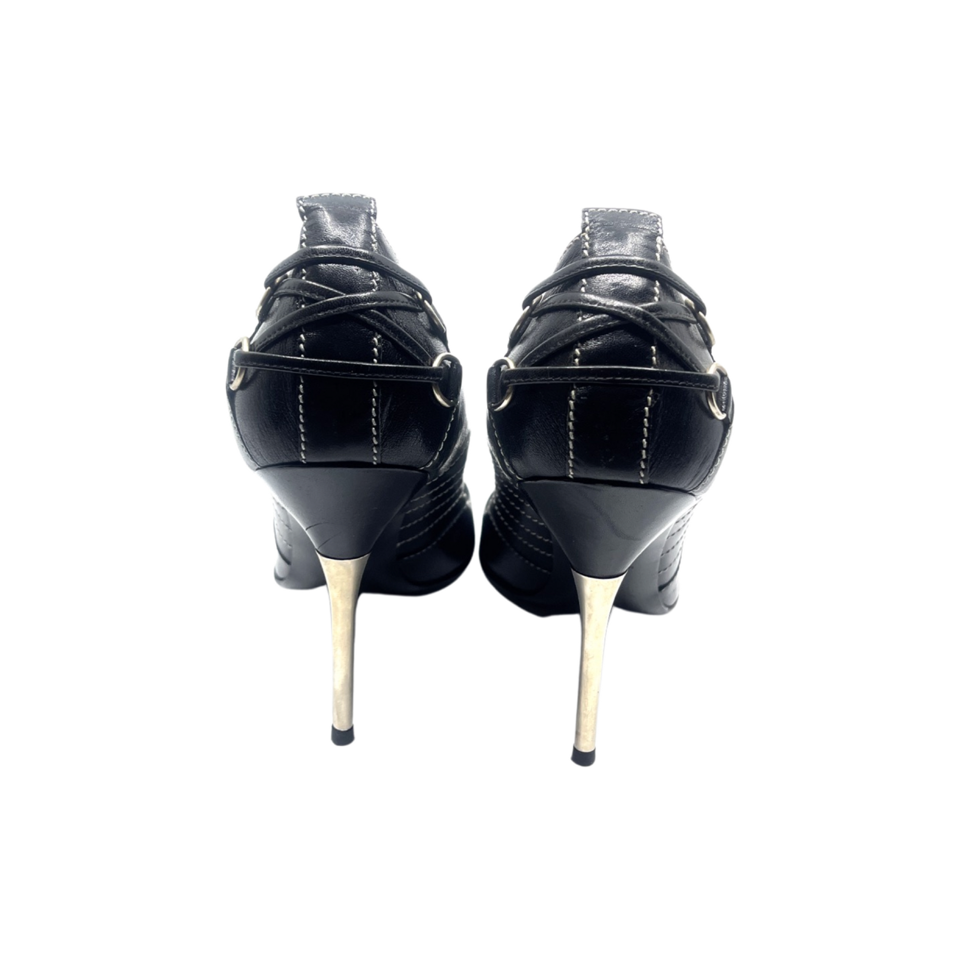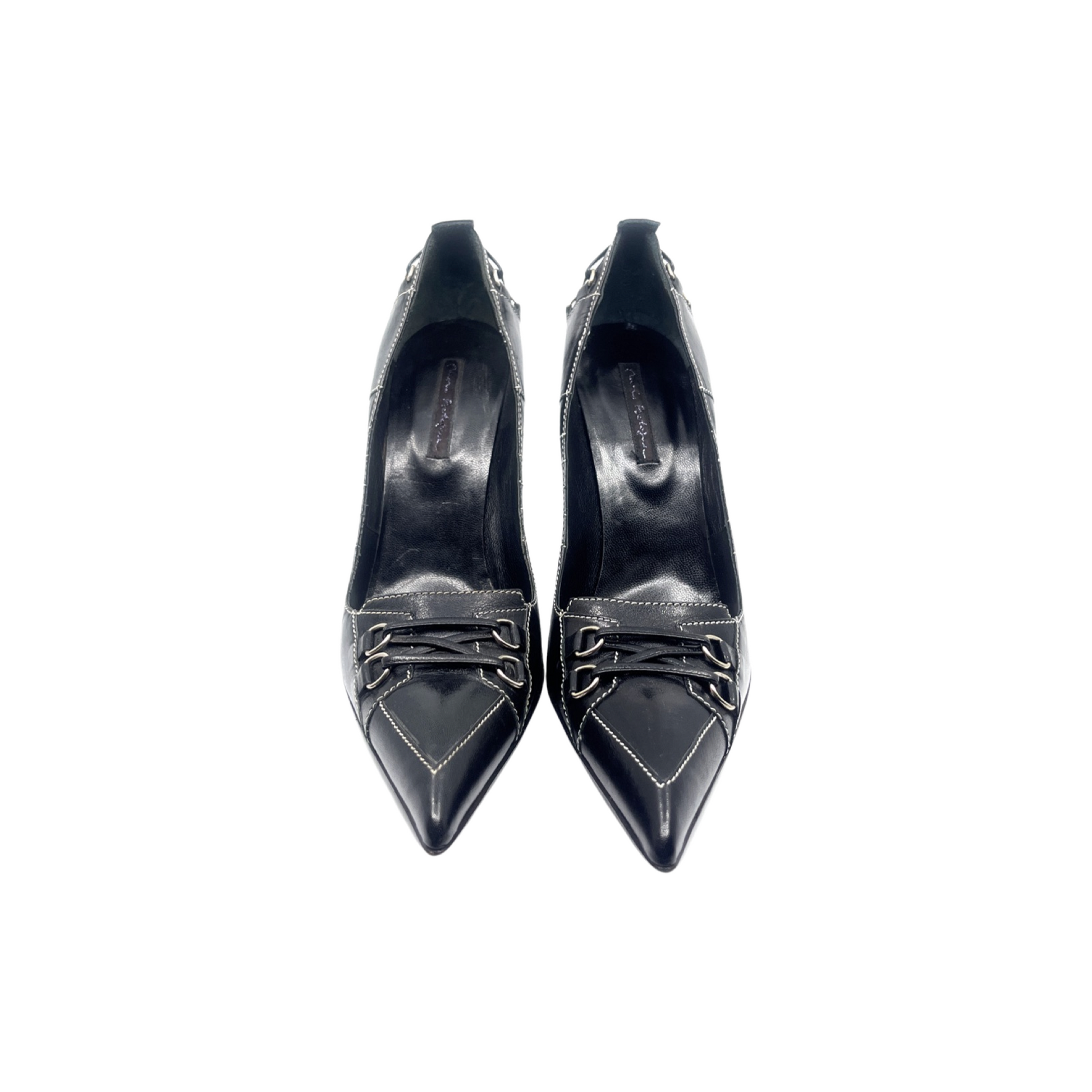 Vintage Italian leather black pump with white contrast stitching and lace up detail with silver spiked heel. Excellent brand new condition.