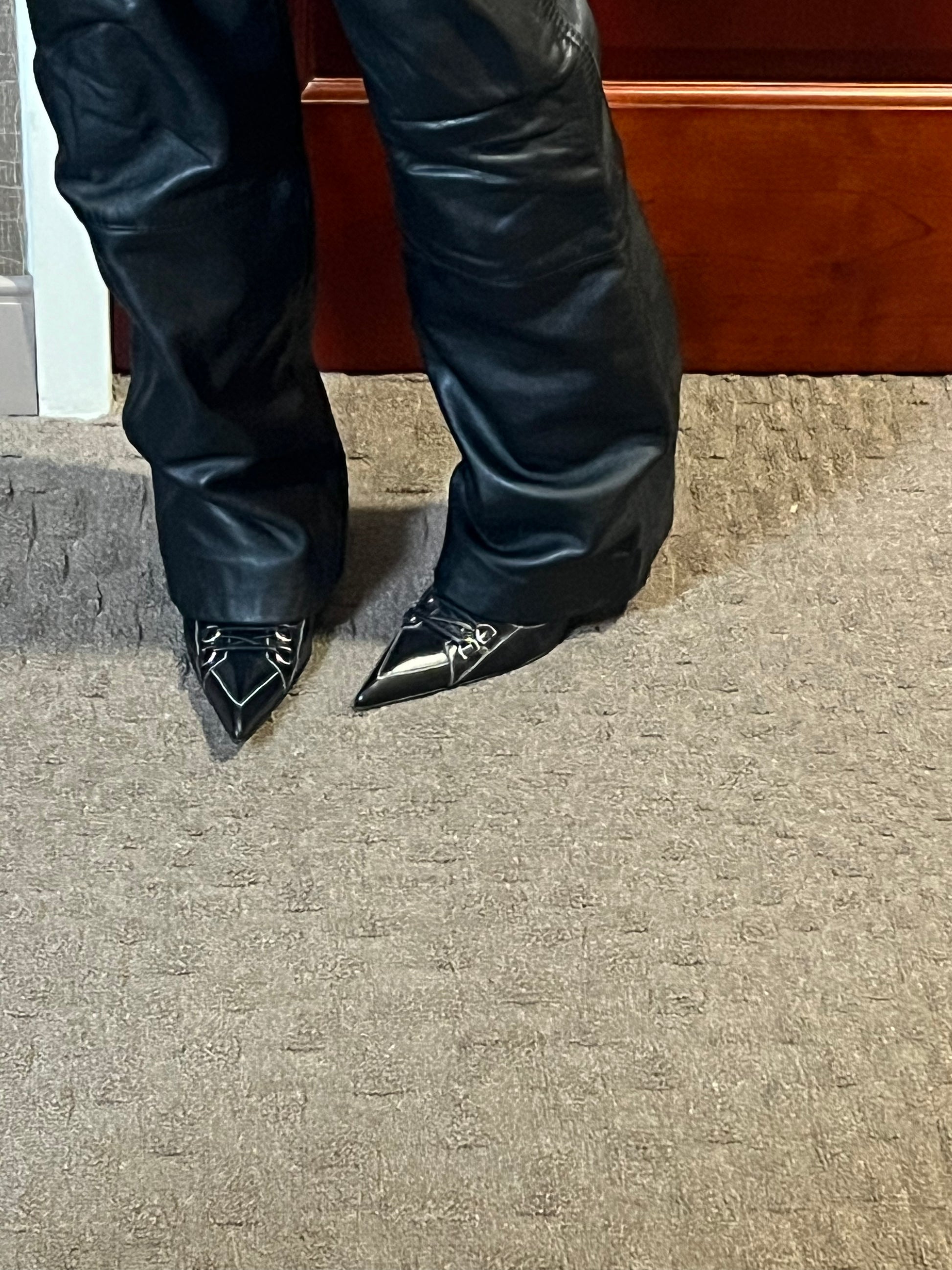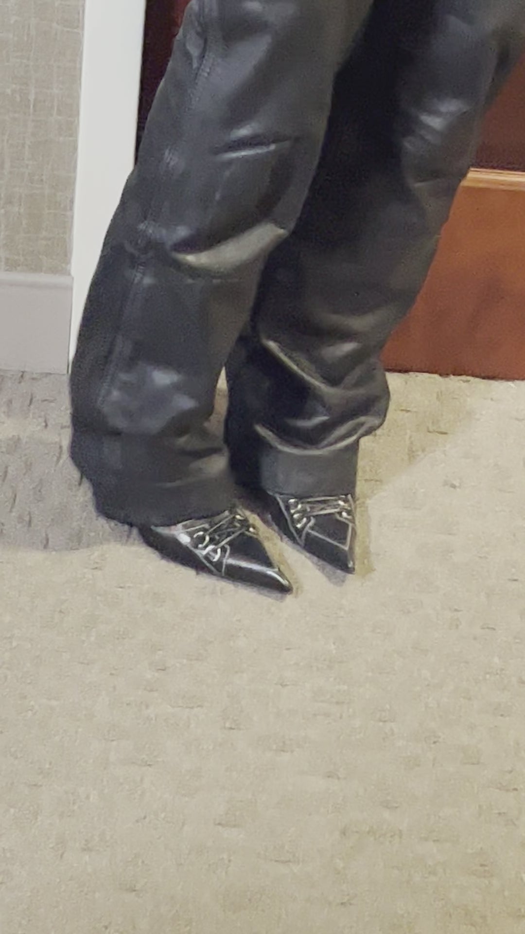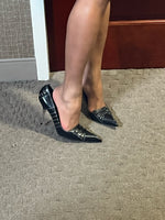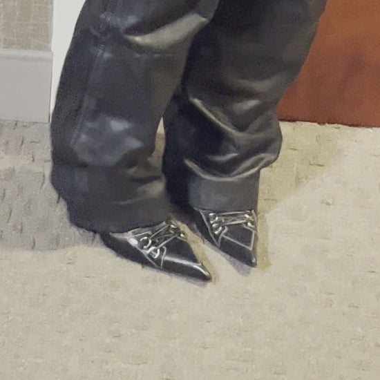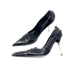 Vintage Italian leather black pump with white contrast stitching and lace up detail with silver spiked heel. Excellent brand new condition.