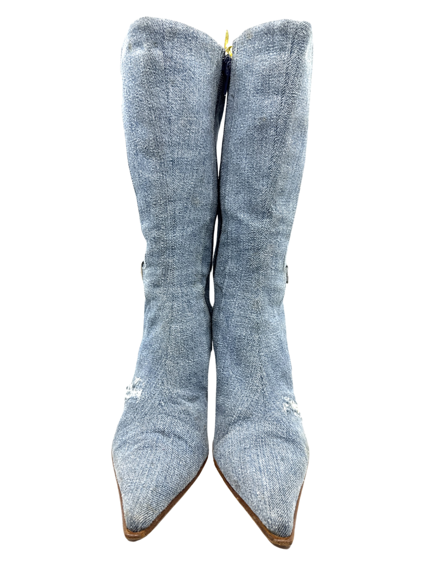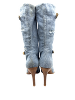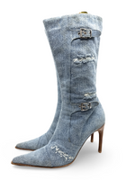 Vintage Italian distressed denim mid calf booties with silver buckle details with wooden heel. Minor discoloration throughout.