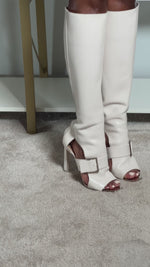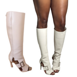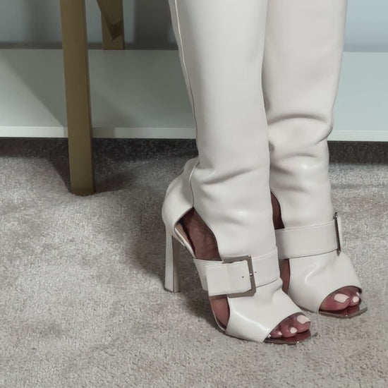 Vintage Italian bone colored peep toe sandal boot with metal toe and buckle. 14inch calf circumference. Runs generous on size perfect for US 8.5-9