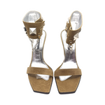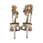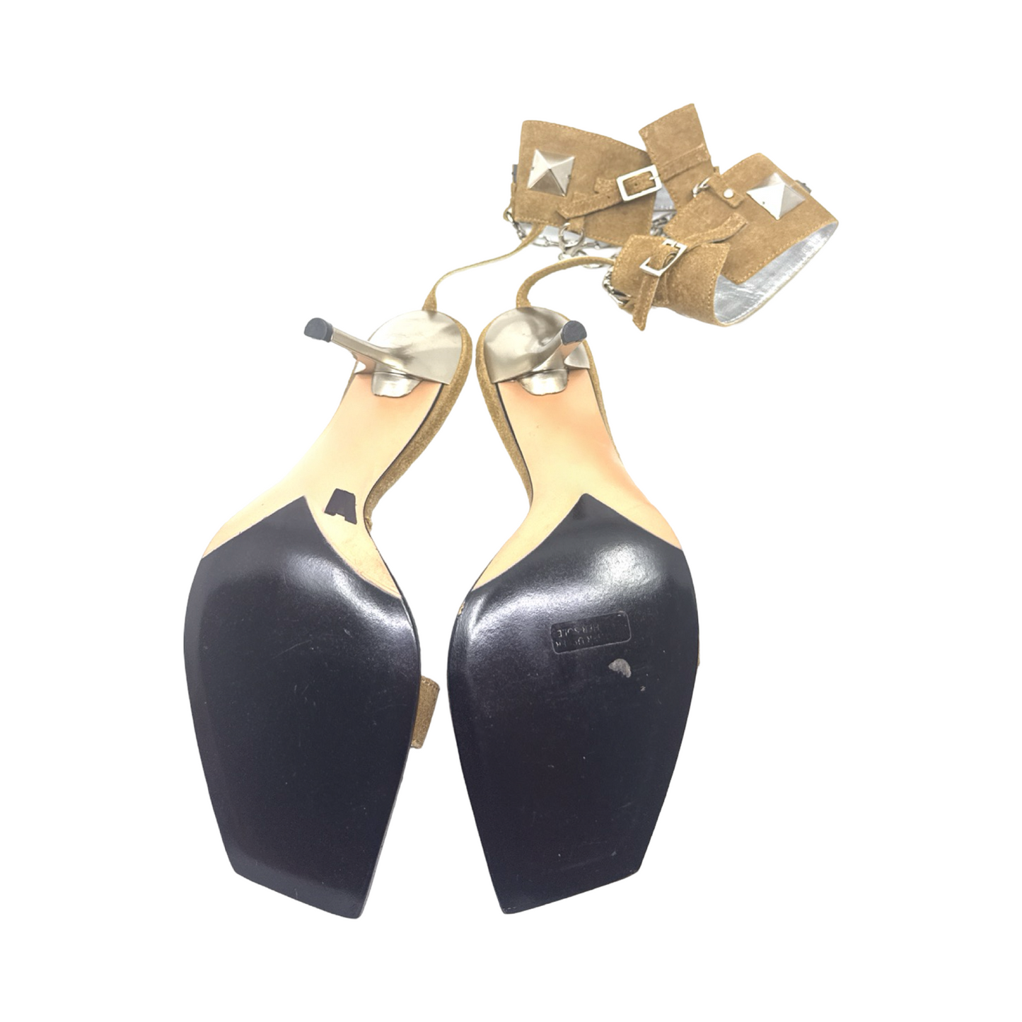 Vintage Italian distressed brown leather sandals with silver pyramid cuff and silver chains. In excellent unused condition. 4.5 inch heel.