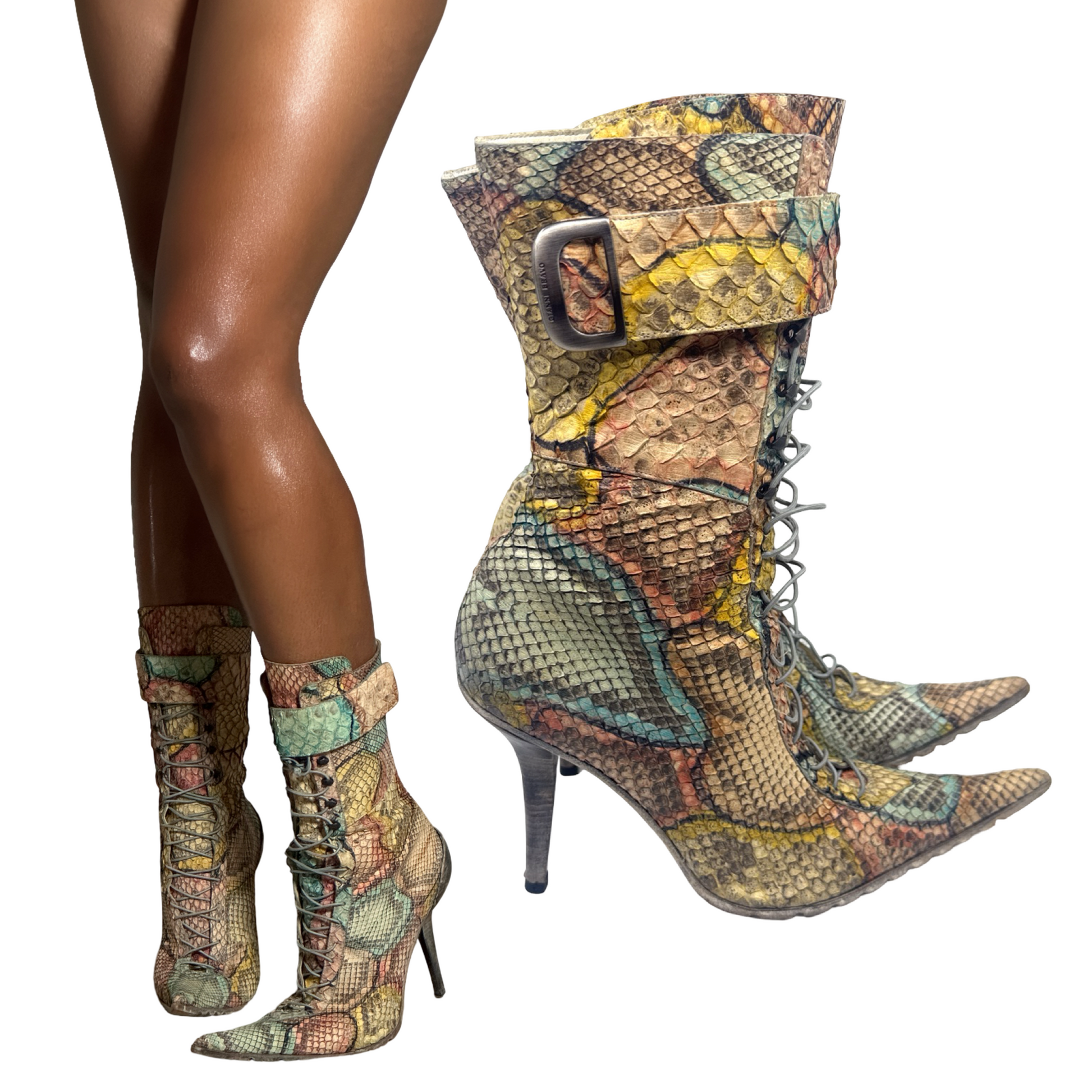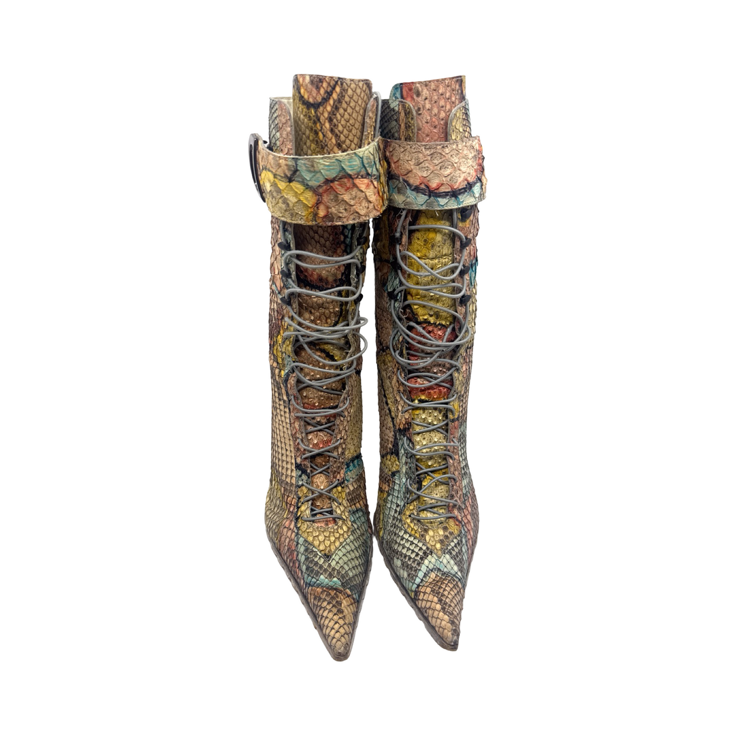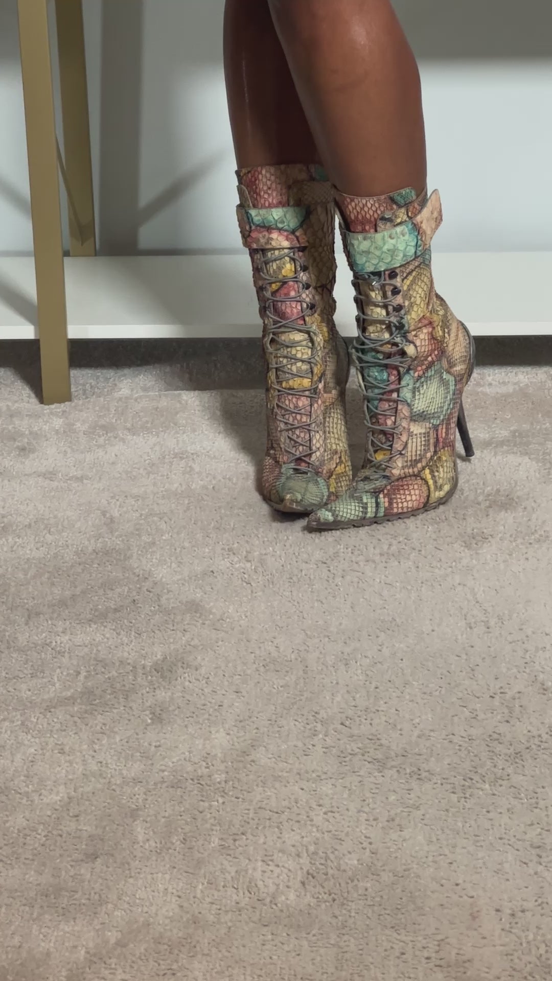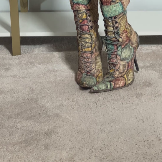 Vintage Italian multi colored python lace up boots. In great gently used condition, 4.5 inch heel.