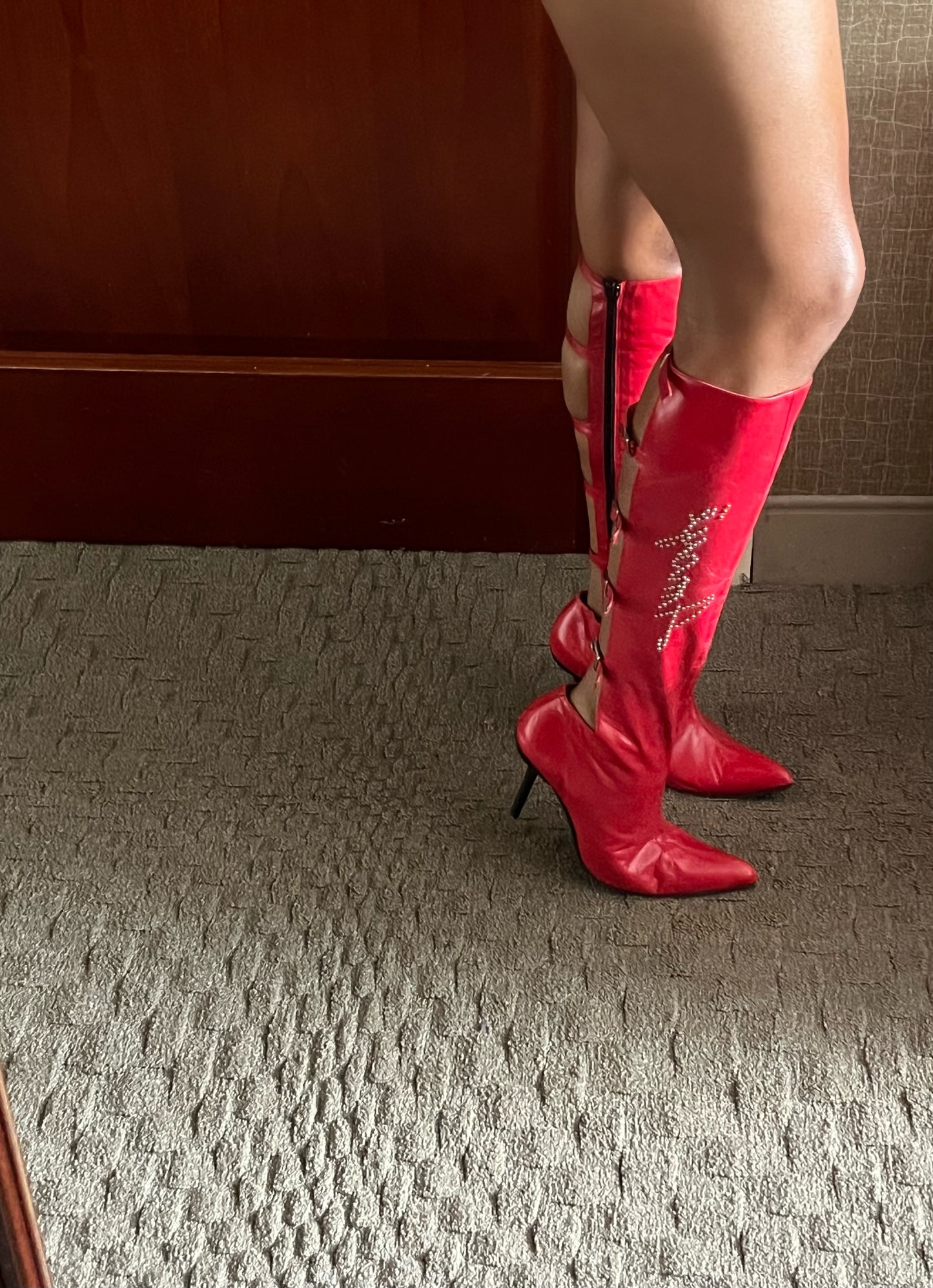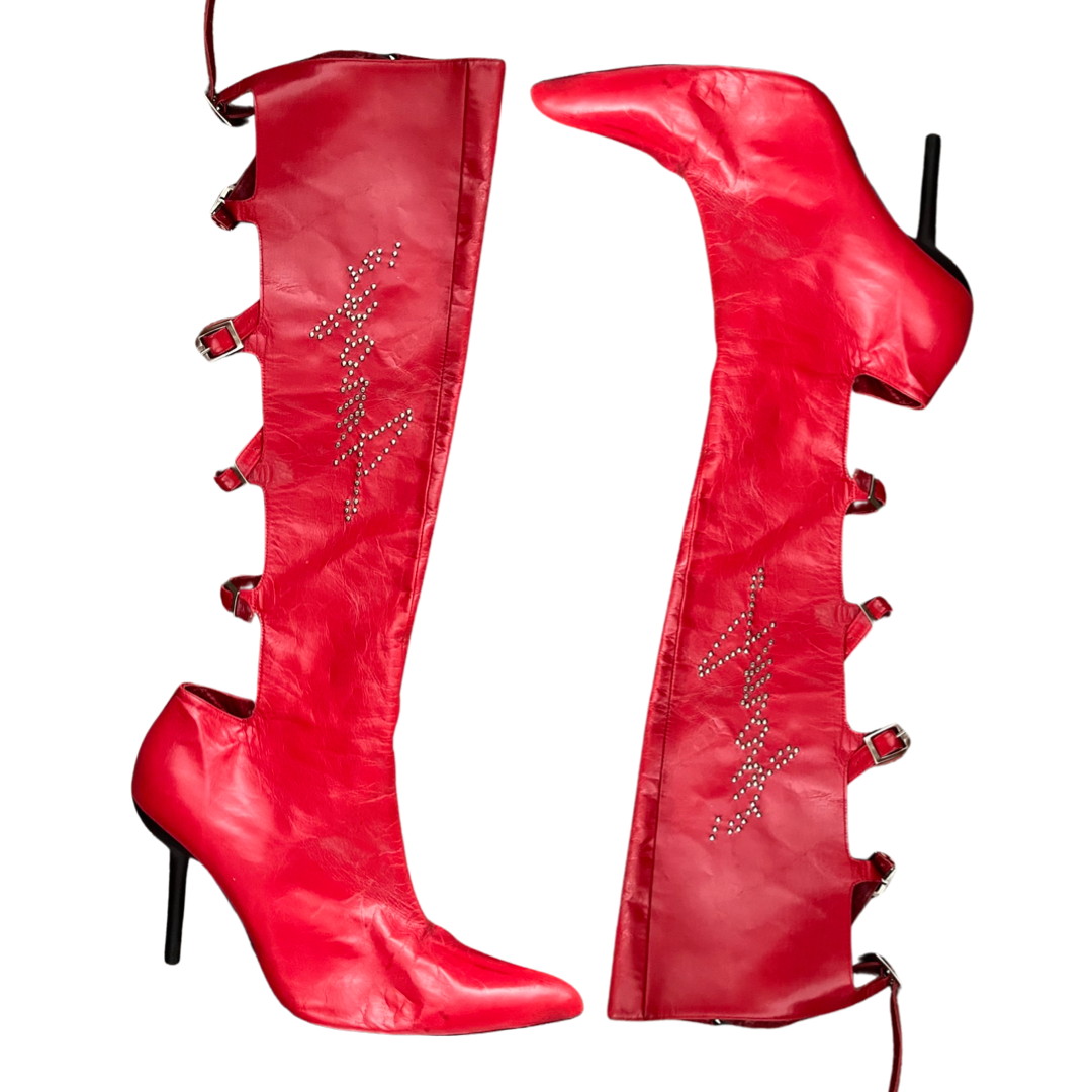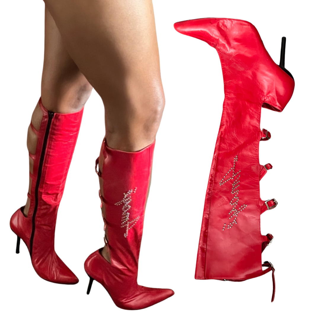 Slutty vintage leather red boots with exposed adjustable buckle back and amore stud details on side. * Marked 41 but fits 9.5-10.