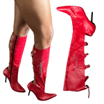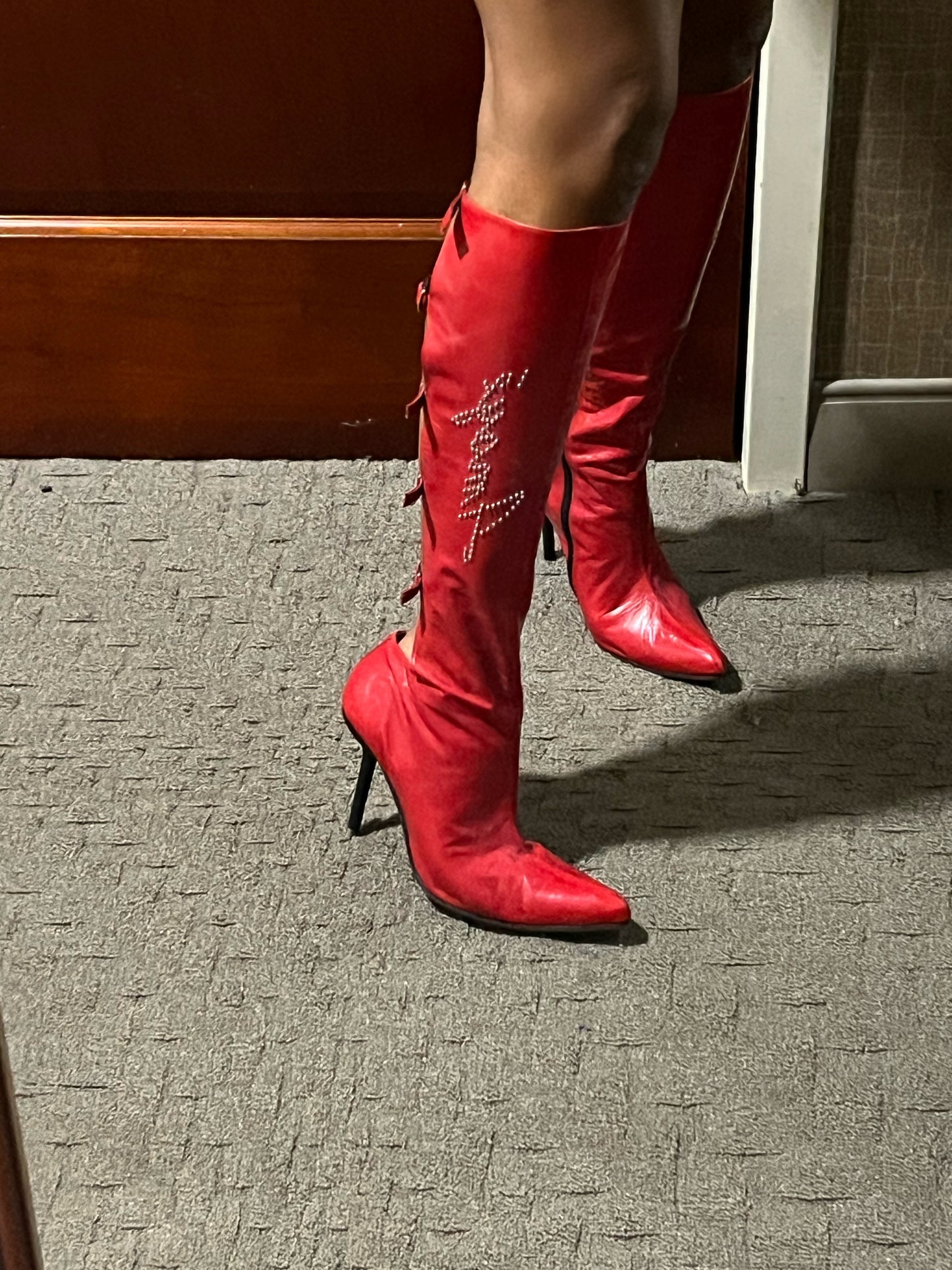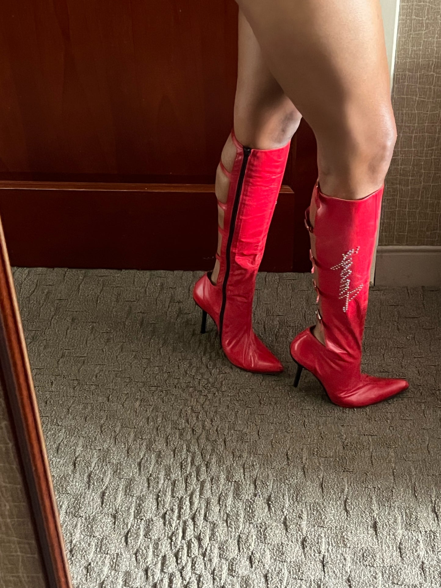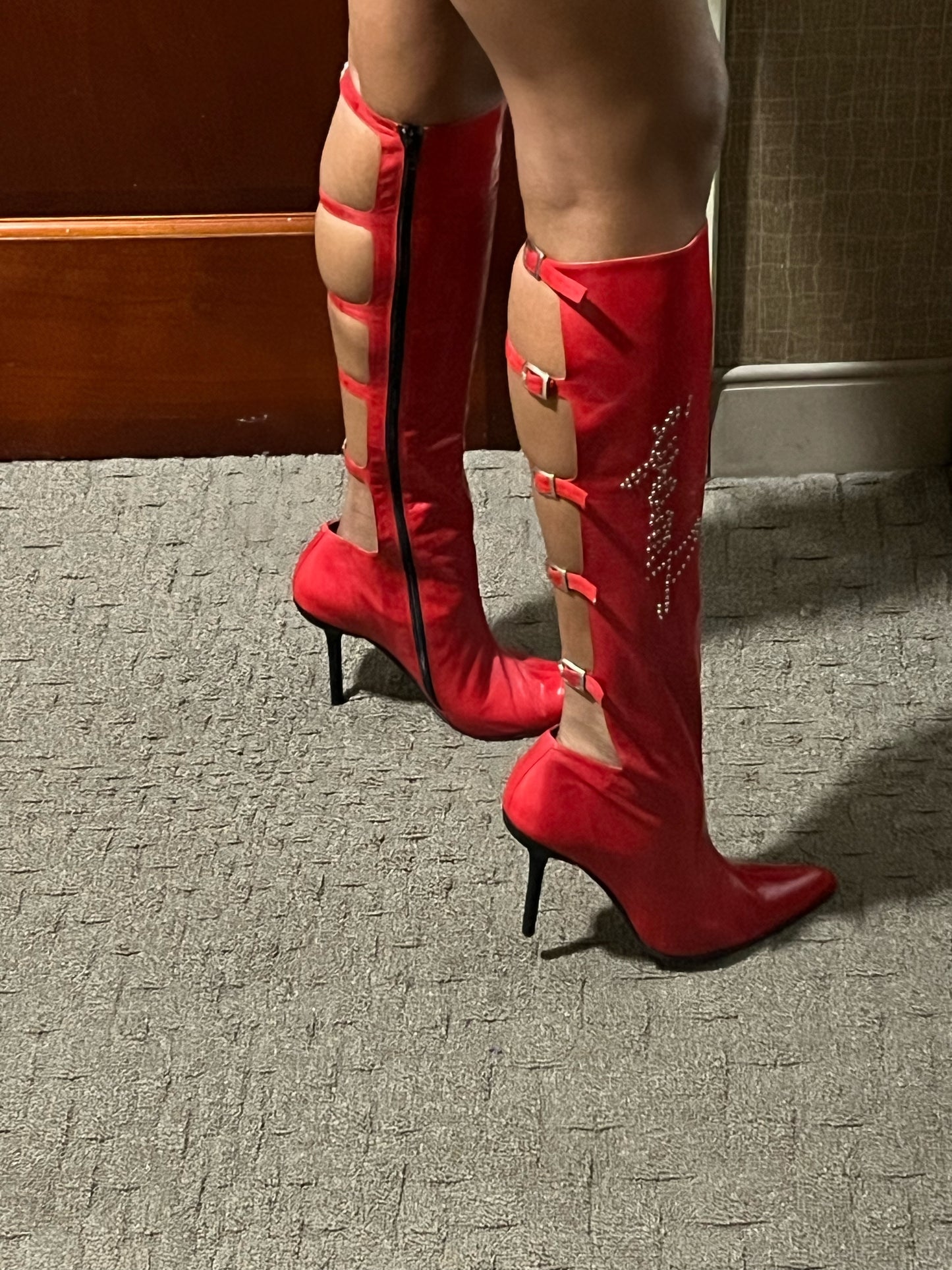 Slutty vintage leather red boots with exposed adjustable buckle back and amore stud details on side. * Marked 41 but fits 9.5-10.