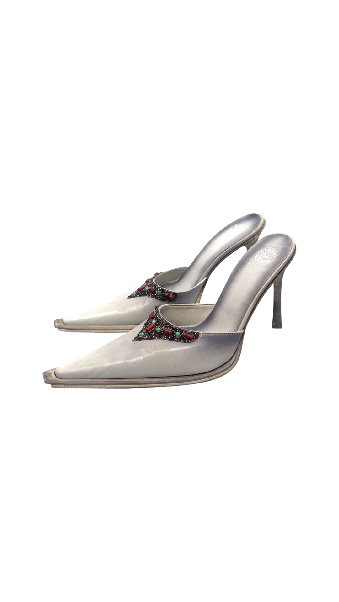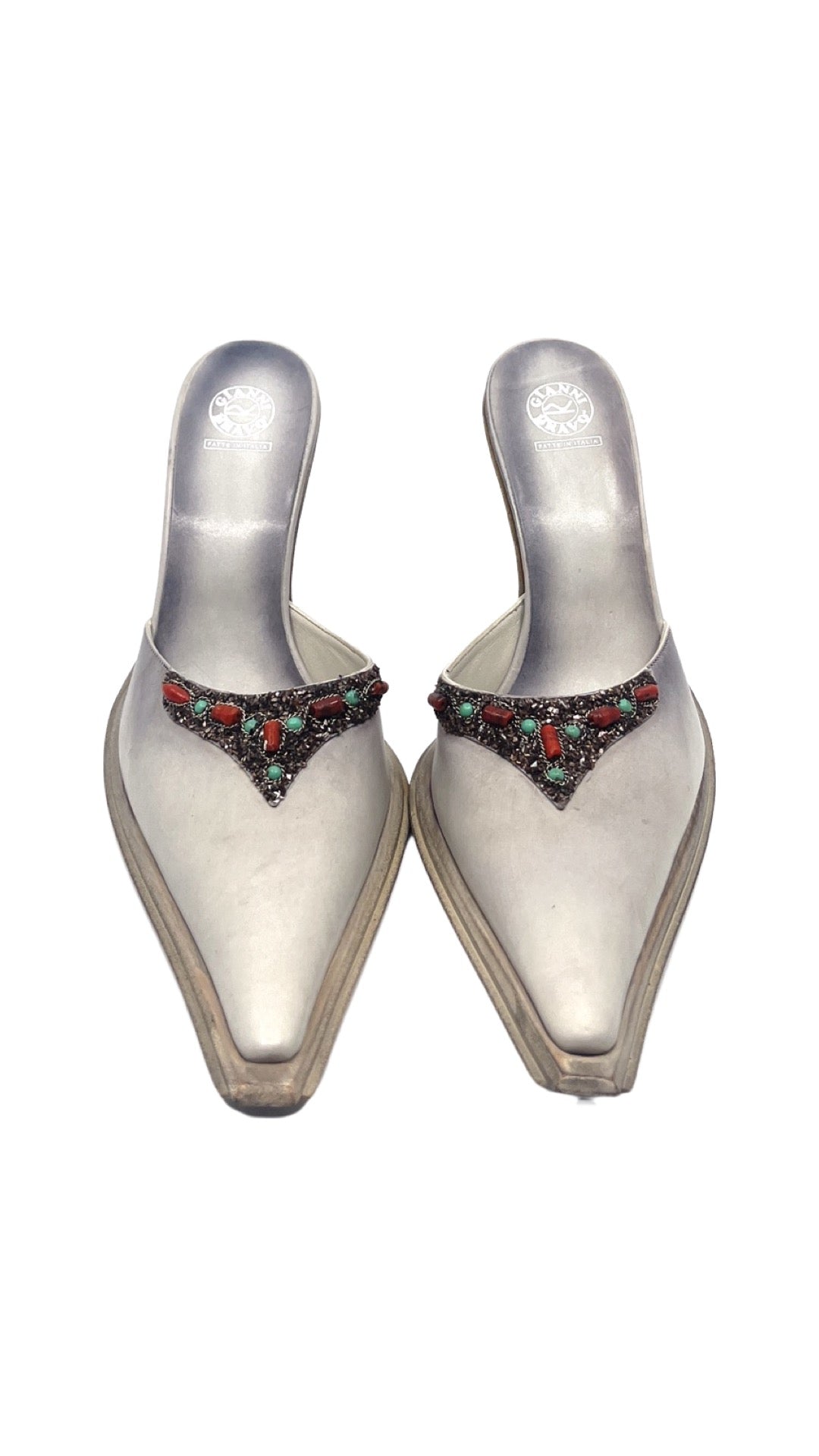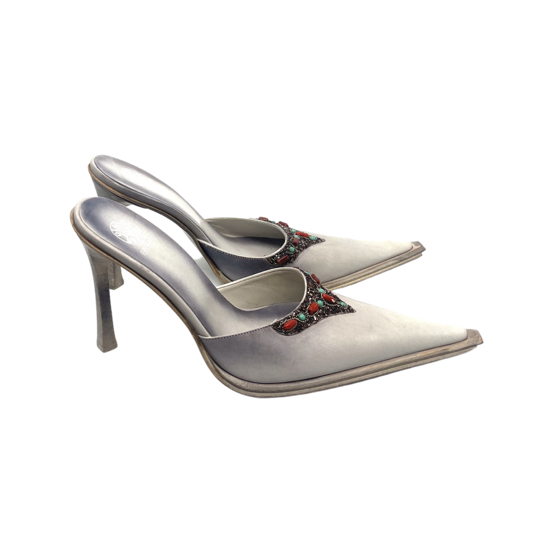 Vintage mule with distressed leather finish and beaded embellishment. Brand new