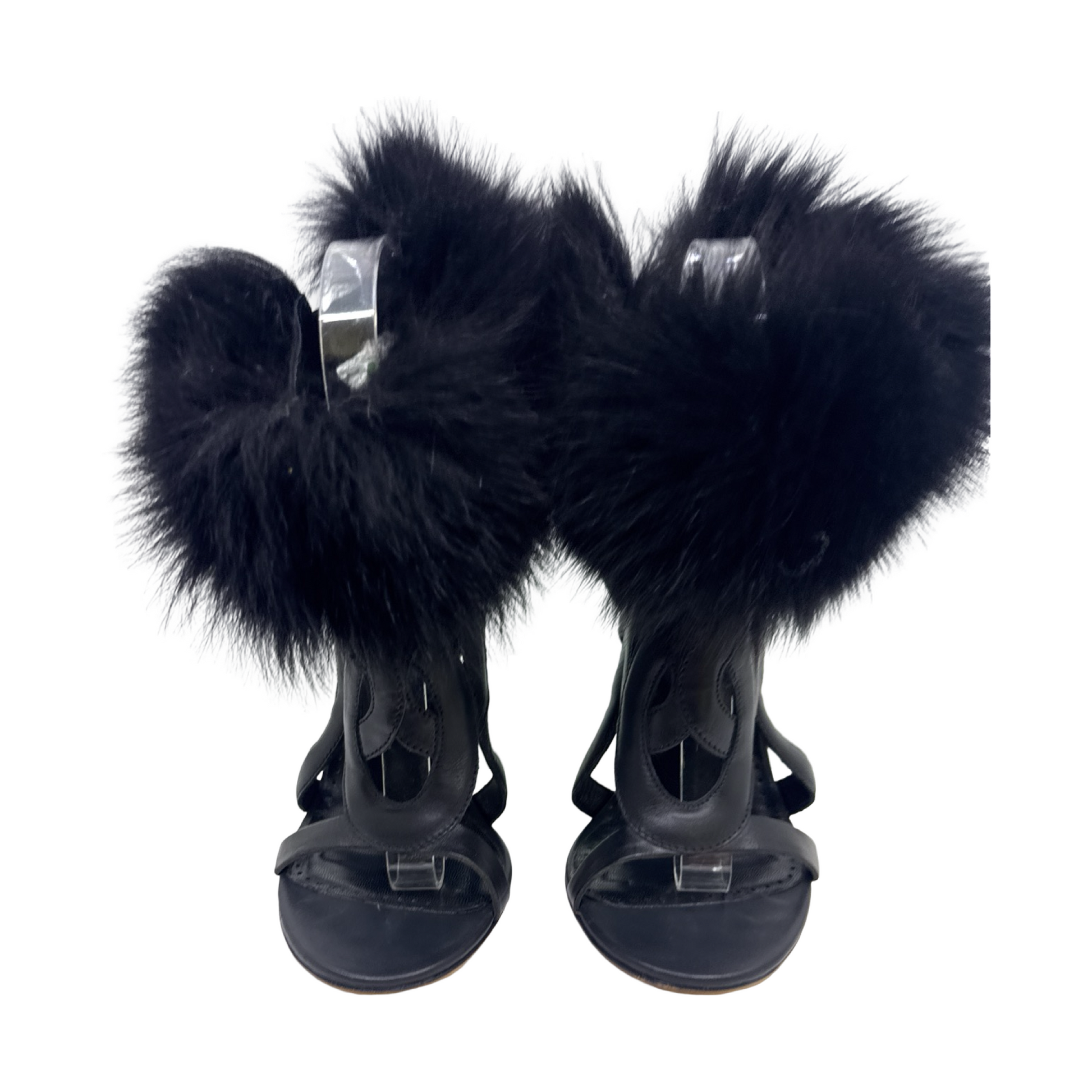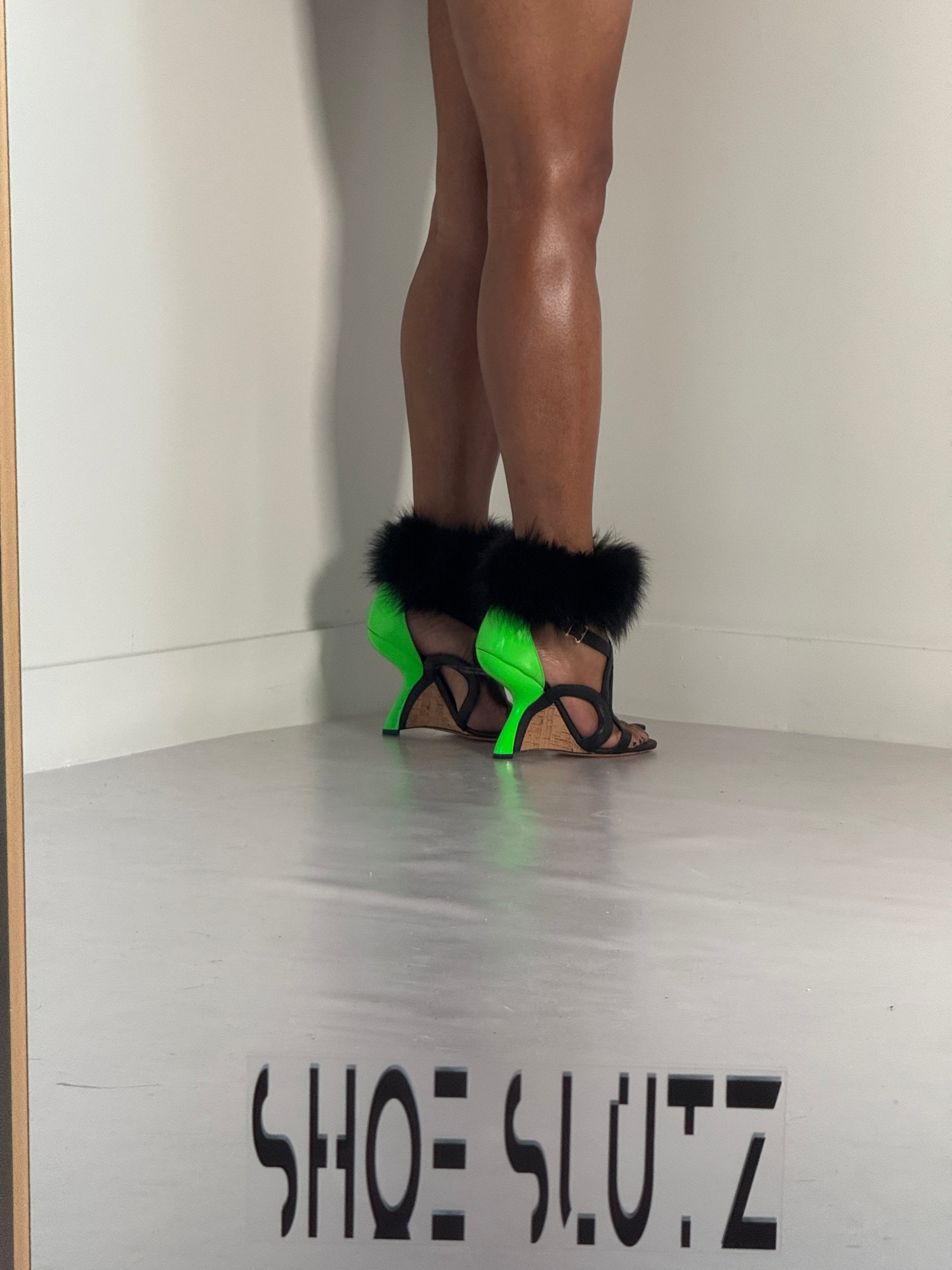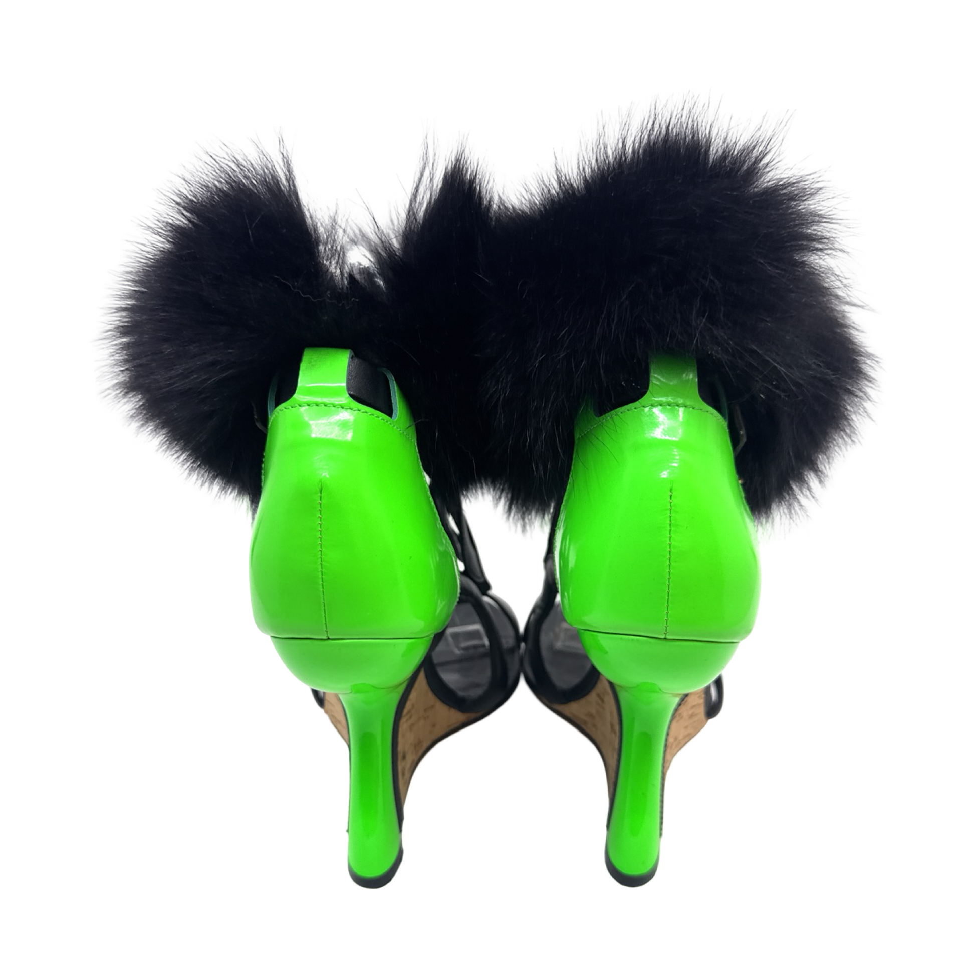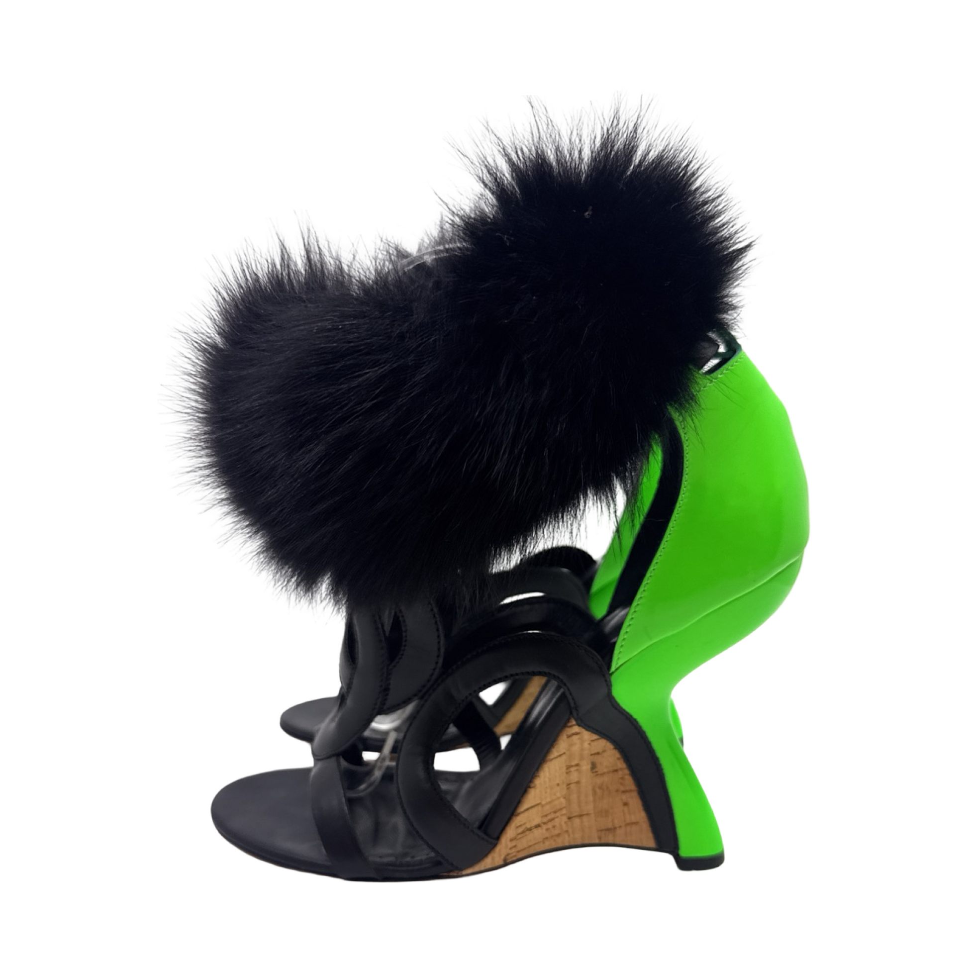 Vintage black leather, cork and neon patent curved wedge with removable fur anklet. In excellent unused condition 4.5 inch wedge.